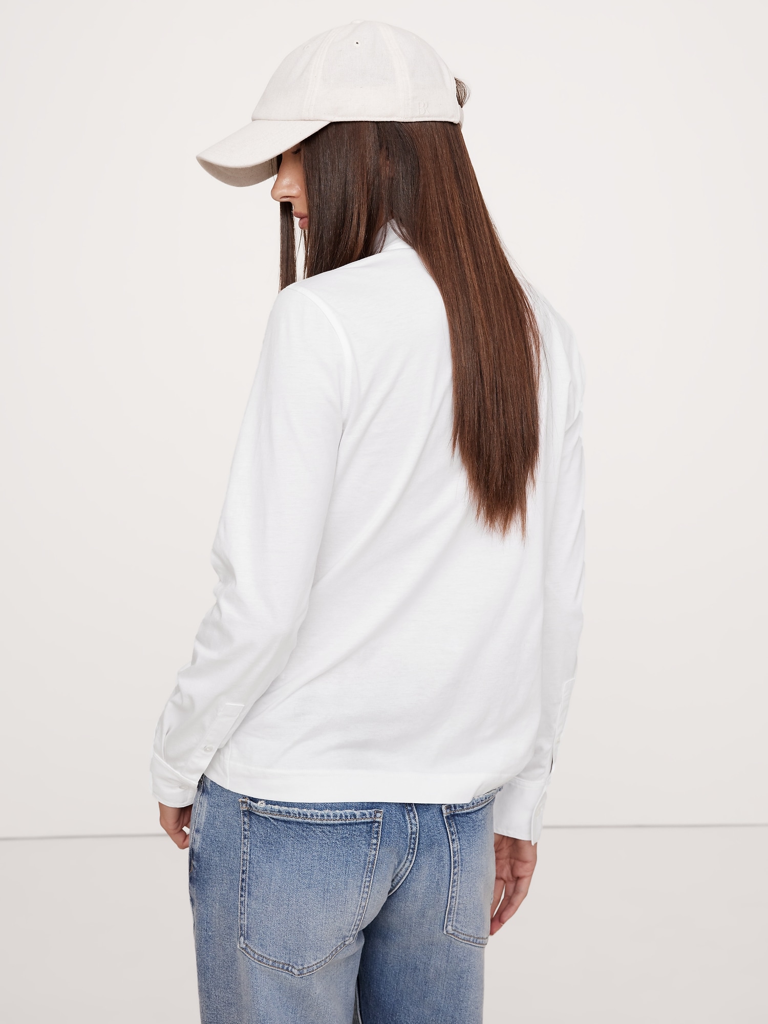 This timelessly tailored long-sleeve shirt is cut from our silky cotton jersey—a fabric we love for its beautiful drape and dressed-up look. Semi fitted. Point collar and button front. Straight hem. #543583