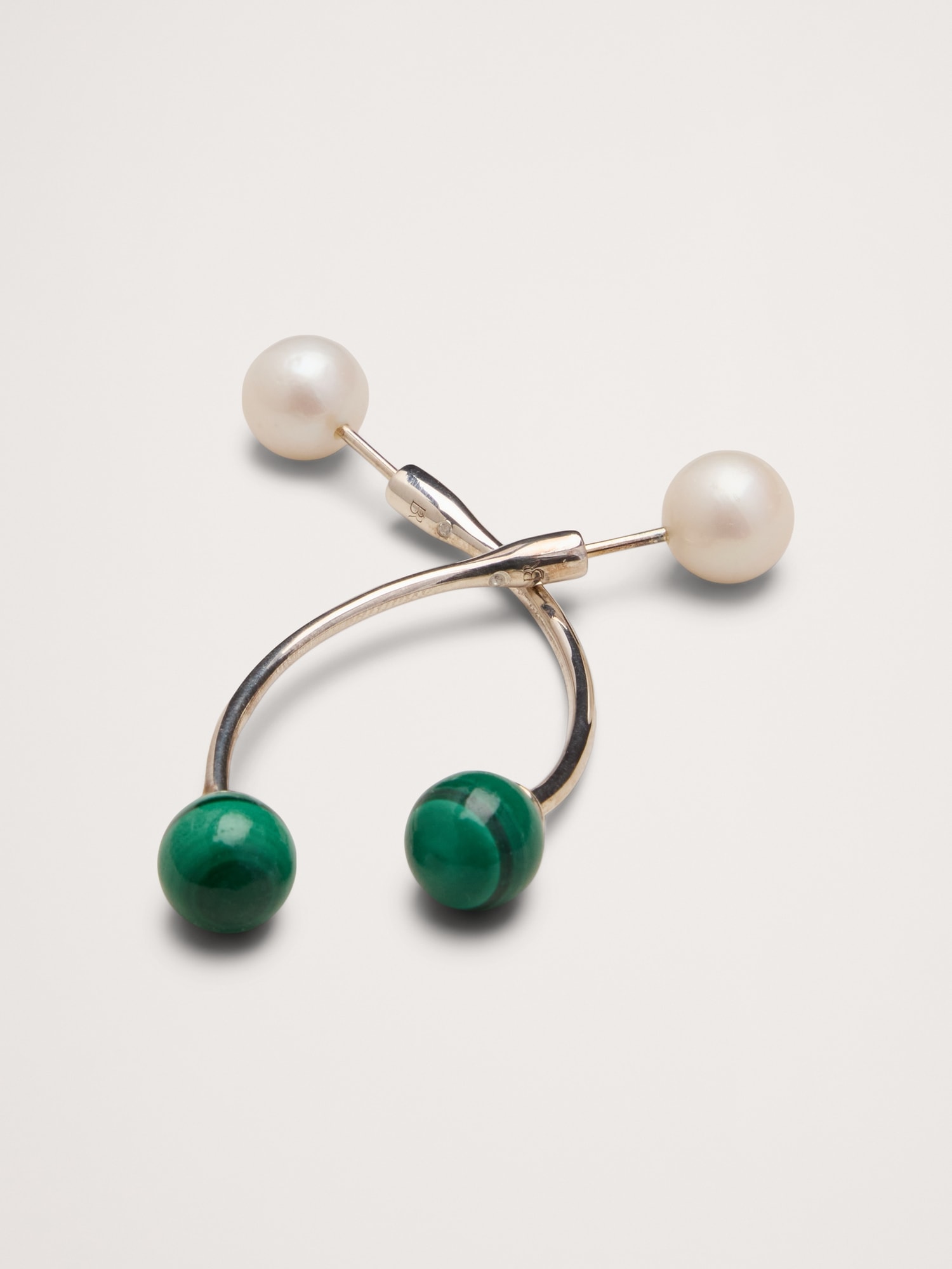 Balanced barbell earrings with freshwater pearl and malachite stone accents, in 14-karat gold plated brass. Can we worn with the pearl facing forward or back.