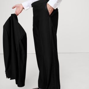 A tuxedo as special as the occasions it’ll see. Note: the Italian wool barathea fabric, the silk faille tuxedo stripe at the sides, and the crisp trouser crease (so they formal). Here, in a straight-leg silhouette.