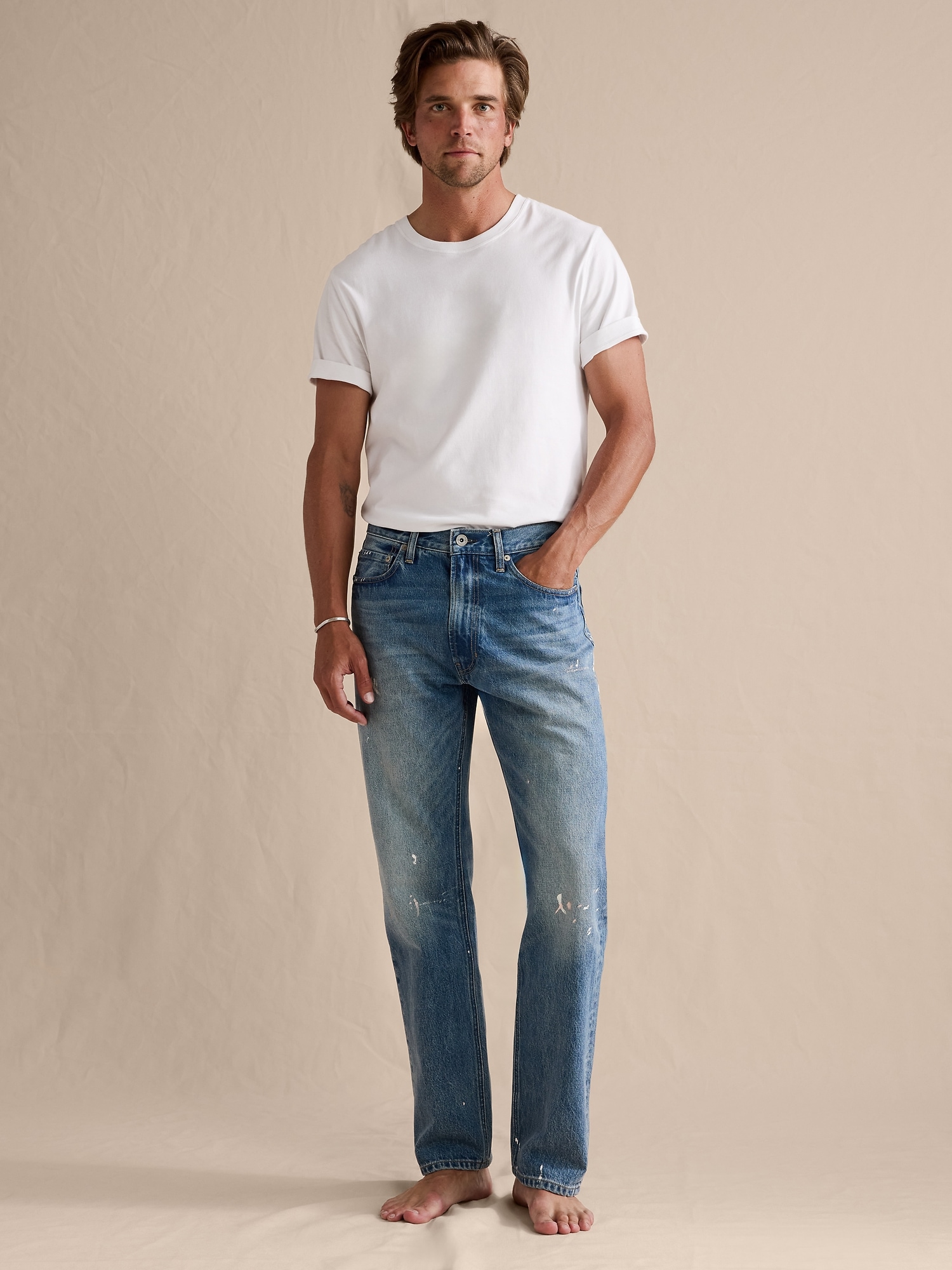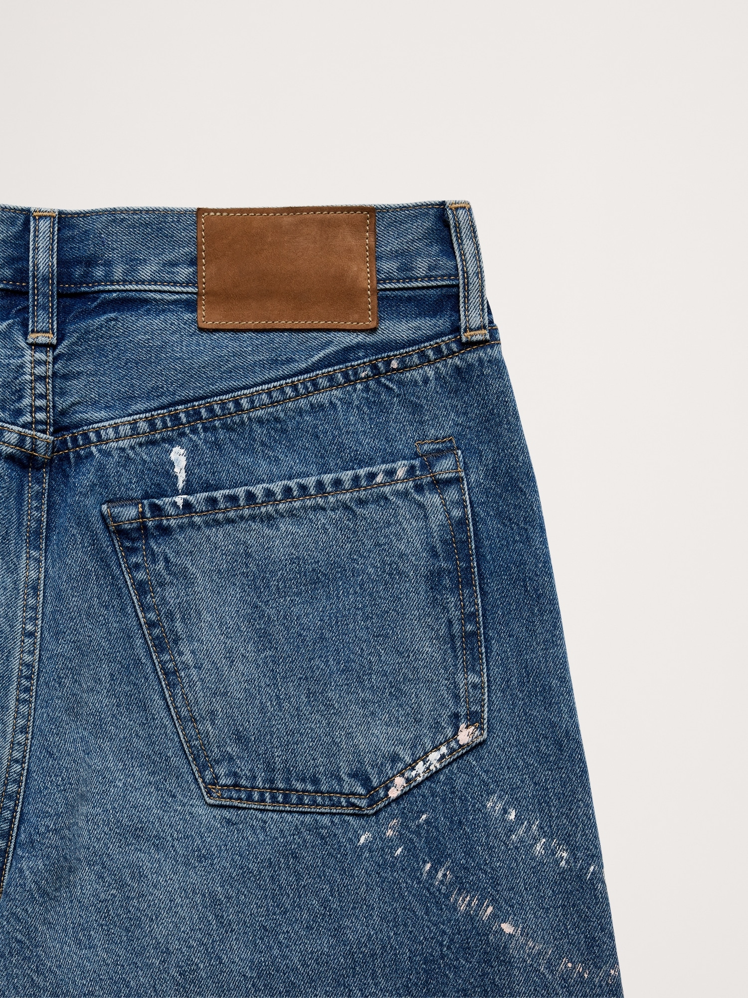 Inspired by a vintage pair, we reached for our Italian denim to recreate them in a straight-leg fit. We added a special wash to achieve the lived-in highs and lows of a well loved pair, plus a paint splatter for authenticity.