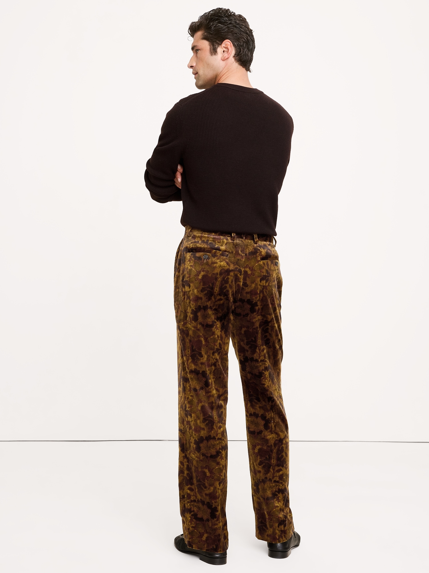 Zip fly with hook-and-bar closure. Belt loops and after-dinner split detail at back.
