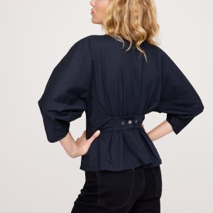 A shirt that says \”I got this\”. We reimagined utility details to create a twist on the classic button placket, seen here in a balloon-sleeve top cut from our stretch-cotton ripstop fabric, with its signature grid texture.