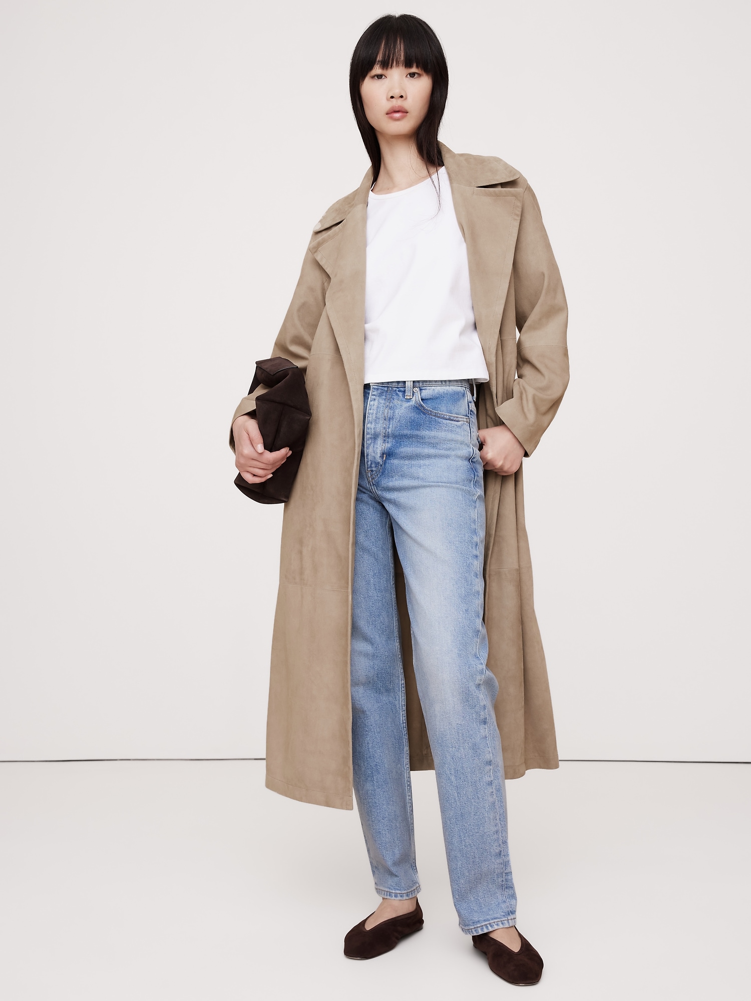 We reimagined the timeless trench coat, preserving the utilitarian vibe of the original with wide lapels, a belted waist, and shoulder epaulettes—crafted in premium suede in one of the world’s most renowned ateliers. Since it’s suede, it will only get better with time, developing a rich and unique patina.