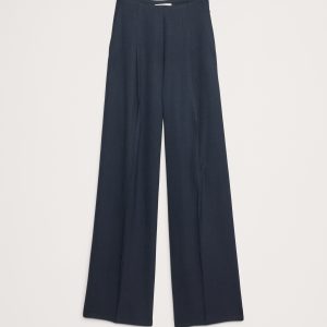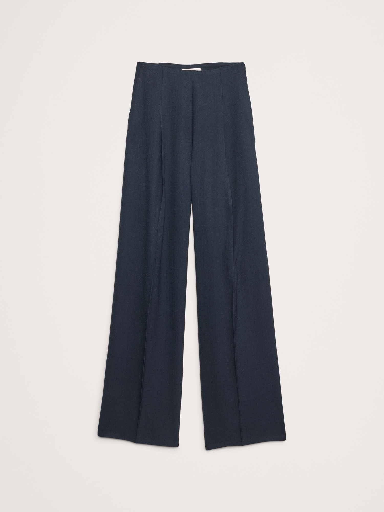 Ultra-high rise (13\”). Fitted waist and hip, relaxed through the thigh with a wide leg. Full length.