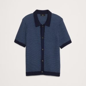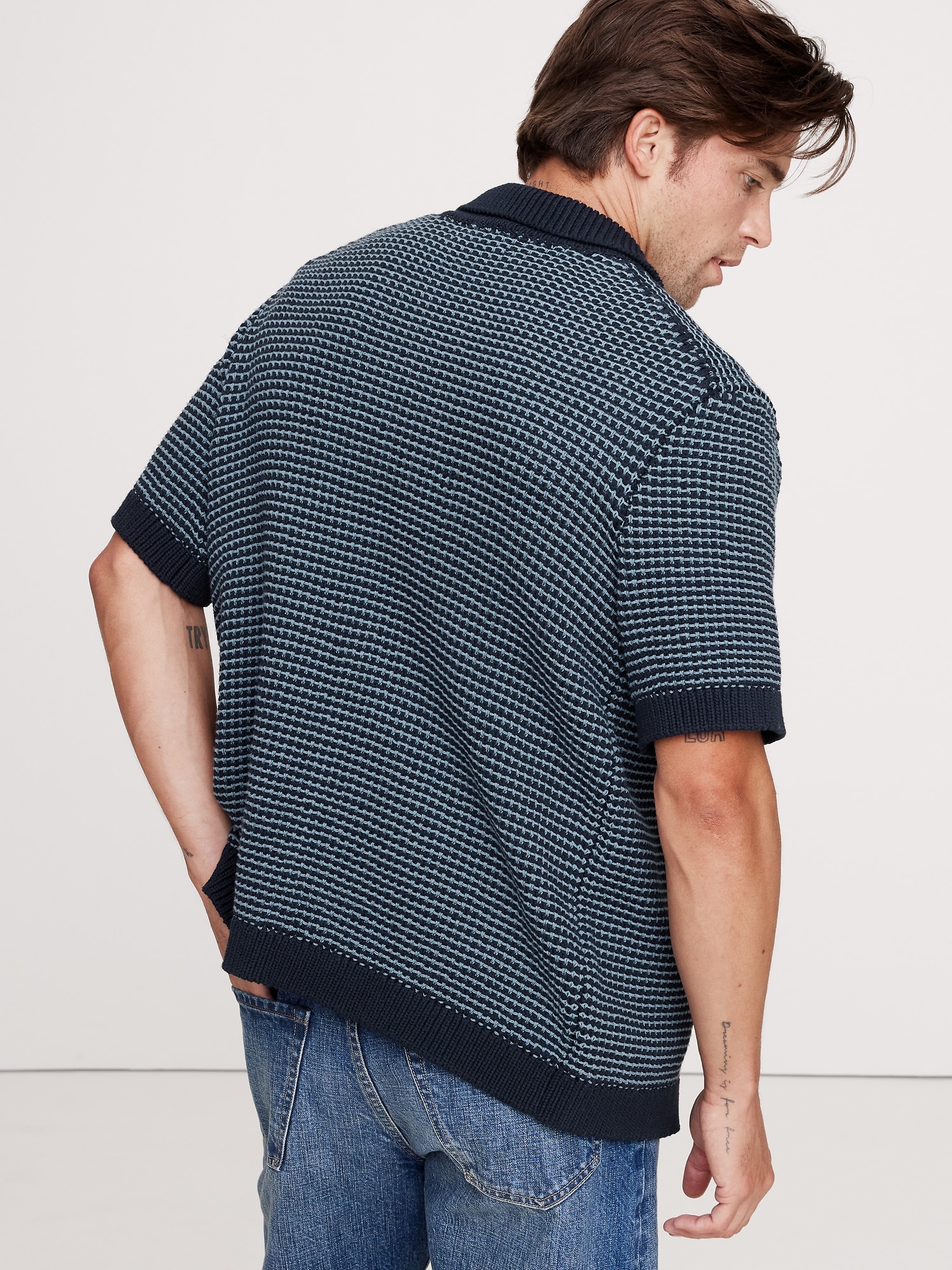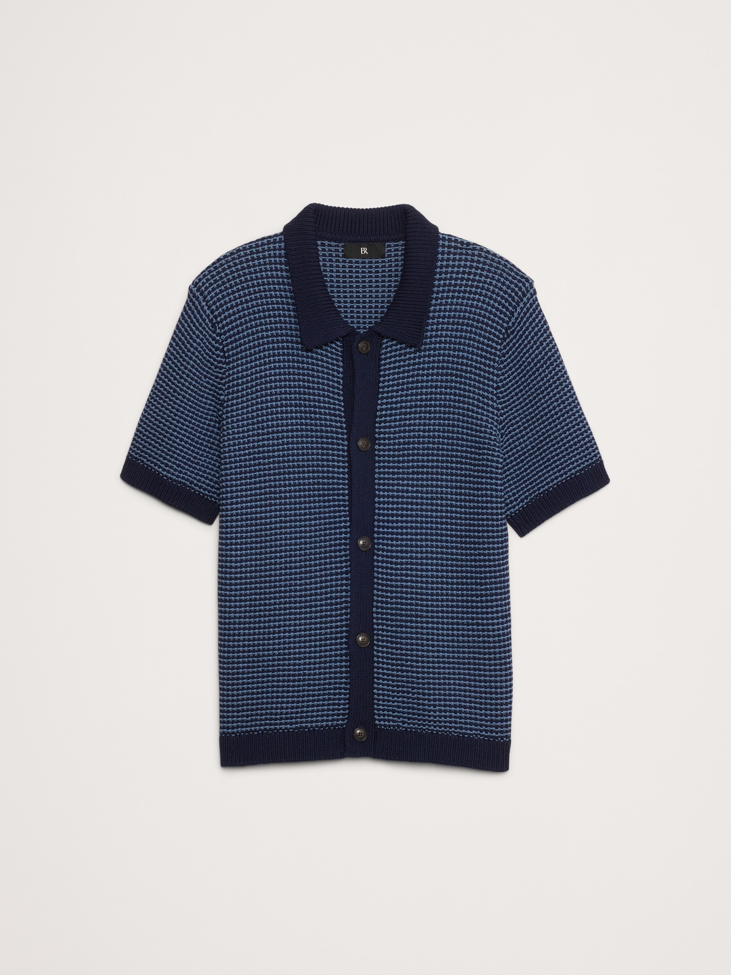 Vintage-inspired, we cut this sweater with a polo collar, button front and two-color waffle-knit stitch to mimic the retro look of sweater polos from the 1960s and 1970s. Crafted in a light cotton-blend yarn.